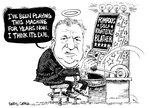 They gleefully report that Bennett, a stern moralist they feel obliged to emphasize, has lost over 8 million dollars in ten years of gambling in Las Vegas. Bennett says that's not true, that he's more or less broken even over that period of time. "I play fairly high stakes," he told Newsweek's ultra-left-wing reporter Jonathan Alter, one of those leading the lynch mob. "I adhere to the law. I don't play the 'milk money.' I don't put my family at risk, and I don't owe anyone anything." The documents, Alter admits, "offer no reason to contradict Bennett on these points." Nor do they offer anything to contradict Bennett's claim that he's beaten the odds, but Alter doesn't mention that, merely reporting without comment Bennett's claim that "Over 10 years, I'd say I've come out pretty close to even." Across America the headlines in America's liberal-drenched media have trumpeted the story with the same enthusiasm they'd report a landslide defeat of Republicans at the polls. The same media, which trumpets the virtues of homosexuality, the killing of babies in the womb, vigorously defended the outrageous immoral behavior of President Clinton, ignores the recent scandal, of Hillary's lies about her 9/11 behavior, and never manages to find anything wrong with gambling when it involves state lotteries have suddenly decided that Bennett's wagers violate some strict moral code. That despite the fact that Bennett's Catholic faith only condemns gambling when it robs people of the ability to pay essential bills such as for food and the rent, hardly the case with Bennett, a millionaire who can afford to bet large sums if he feels like it. It is, after all, his money. Ask yourself, what has he done wrong? He hasn't hurt anybody; he hasn't inflicted pain on anybody so it's obvious that somebody - in this case our wonderful, fault-free liberal-dominated media - has it in for him. ![]() ©Daryl Cagle, Slate.com There is a lesson here for every conservative the liberals in the media hate as they hate men like Bennett for condemning the moral outrages they defend or ignore: Look over your shoulder, Rush, be careful what you do, Sean. They're watching you. Spit on the sidewalk and they'll be on your back like a pack of hungry wolves going for the kill. If you're a liberal Democrat, however, you don't have to worry. With you anything goes. Ask Bill Clinton. If gambling is the sin the media has now discovered it to be, every American who buys a lottery ticket is a grievous sinner. Gambling is gambling. Everybody who's ever bought a lottery ticket, everybody who's ever been to Vegas, anybody who's ever played bingo has no right to be angry with Bill Bennett. If his gambling is wrong, their gambling is wrong too. Shun the church bingo parlor, don't buy lottery tickets. Just be a good little taxpayer and shell out your money so the schools can afford to buy condoms for your kiddies. The media won't mention it, but the biggest gambling institution of all is government. Most states are utterly dependent upon lotteries to pay their bills and keep the schools open. It's okay for them, but wrong for Bill Bennett to make wagers even though he can afford it. I think what bothers the media